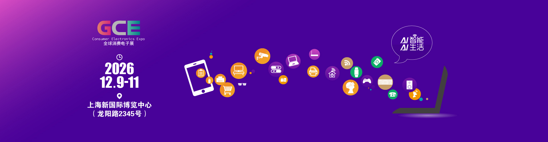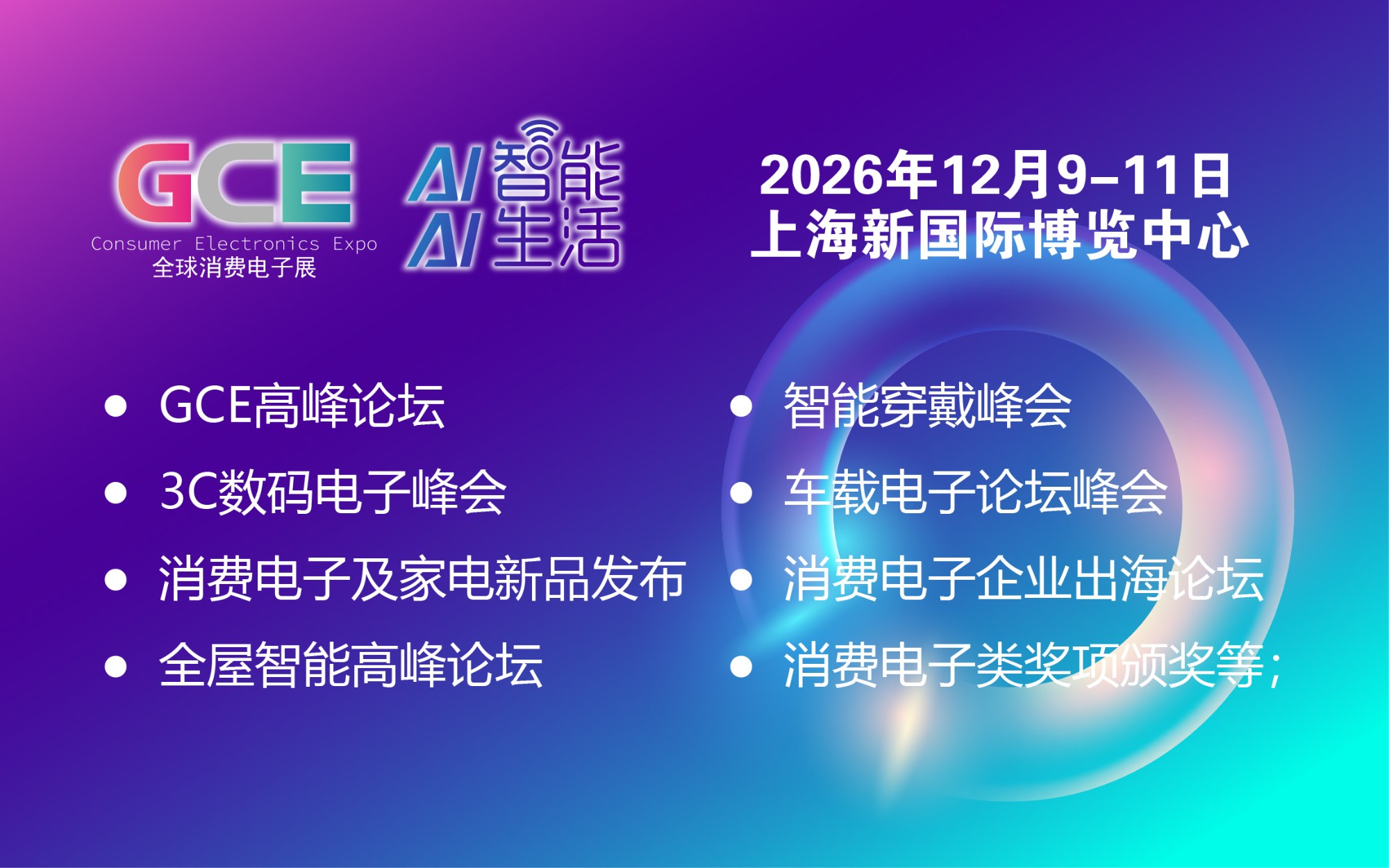 全球消费电子展暨上海国际消费电子及家电展览会“GCE”,将于2026年12月9-11日在上海新国际博览中心(龙阳路2345号)举办。以“AI智能,AI生活“为主题,致力于为全球消费电子及家电生产企业、代加工商、代理商、国内国际采购商、零配件商、相关产业服务供应商等打造全面、集中的一站式采购交易合作平台,集中展示3C电子、智能穿戴、音视频产品、家用电器、个护电器、手机及平板周边、电脑及游戏周边、车载电子等产品及技术,汇聚了新品体验场景、贸易商洽机会、技术战略交流环境、品牌传播声量、多维度用户人群、跨界交流平台、资本市场关注,是提升产业社会关注度和影响力,为参展品牌和合作伙伴全面赋能的重要平台。引领电子电器消费潮流,打造全球消费类电子及家电市场风向标。